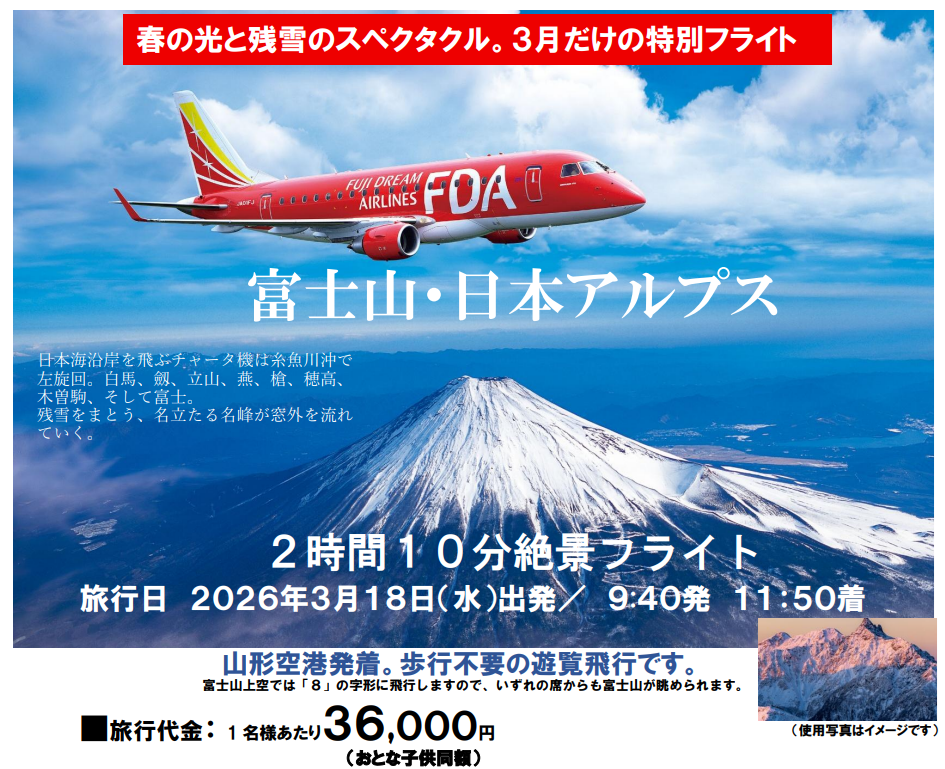 山形空港出発:9:40出発後、日本アルプスを越え富士山へ富士山上空では「8」の字で飛行しますのでいずれの席からも富士山を眺められます。